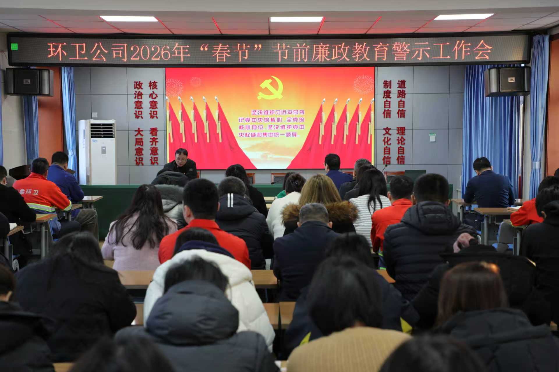 环卫公司组织节前集体廉政谈话,筑牢干部职工廉洁自律思想防线。会议强调环卫工作关乎民生与政府公信力,要求全体人员恪守“十个严禁”,紧盯关键岗位守牢廉洁底线;注重家风建设,管好身边人,同时要求各部门压实主体责任,排查苗头性问题。干部职工均表示将严守廉政要求,在做好节日环卫保障的同时坚守廉洁初心,切实以廉洁履职守护城市洁净、守护民生福祉。