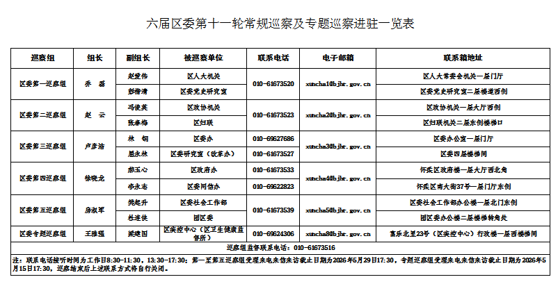 近日,六届区委第十一轮巡察及专题巡察完成进驻。5个区委巡察组对区委办、区政府办、区人大机关、区政协机关、区委研究室、区委党史研究室、区委社会工作部、区委网信办、团区委、区妇联10个单位党组织开展常规巡察。同时,按照市委巡视工作部署,成立1个专题巡察组,对区疾控中心(区卫生健康监督所)开展专题巡察,聚焦“生活垃圾分类”开展专题监督。